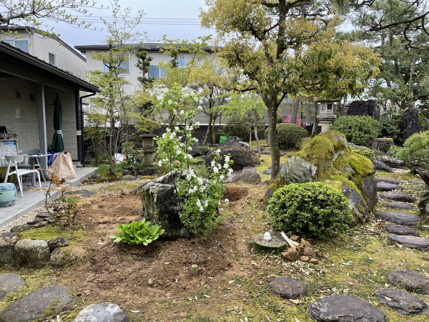 このお庭ではお庭を使って演奏会やお月見会などイベントとして使われる事があり、広場と腰掛けれる場所を設けました。