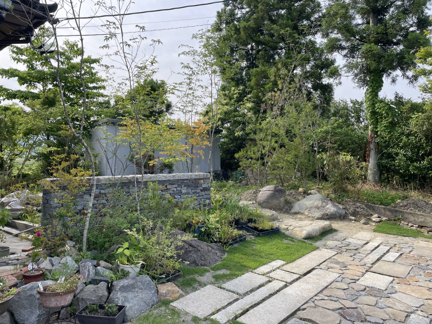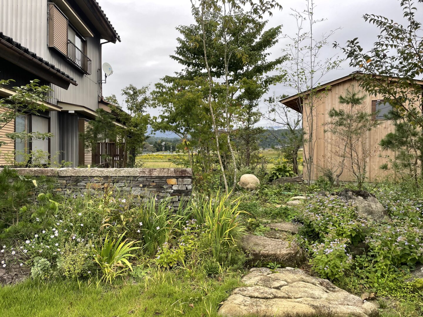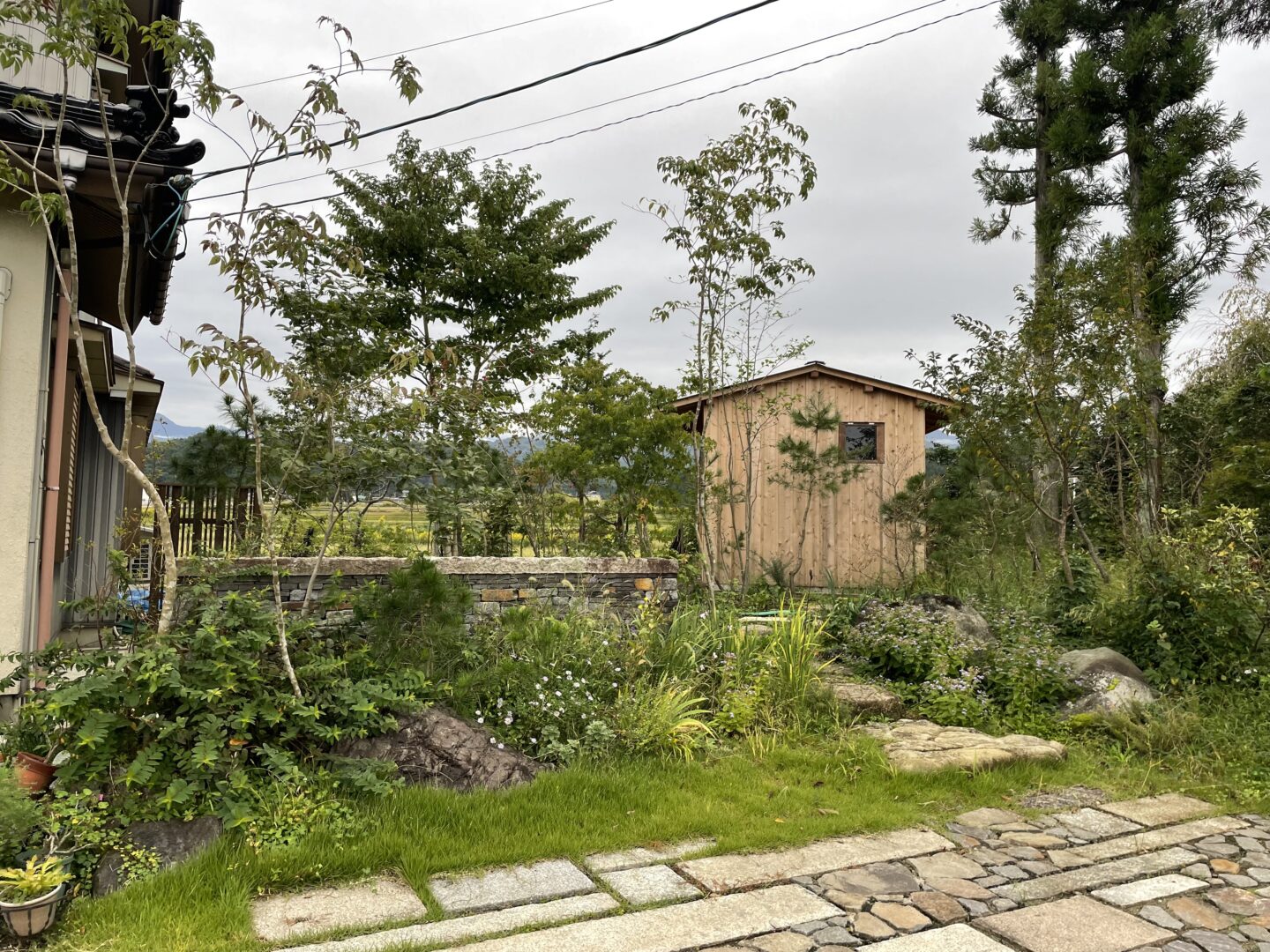 小屋をお庭の背景としても捉えて、手前に雑木などを植栽し森の中のアトリエというテーマで構成しております。