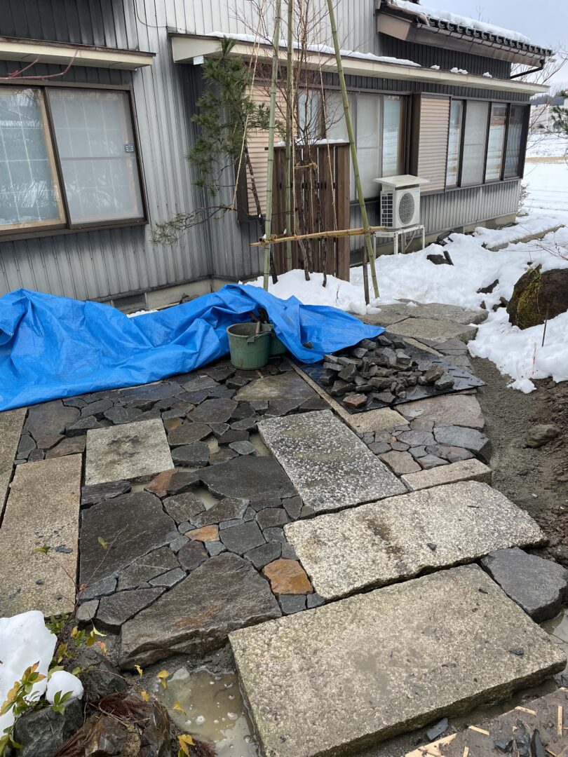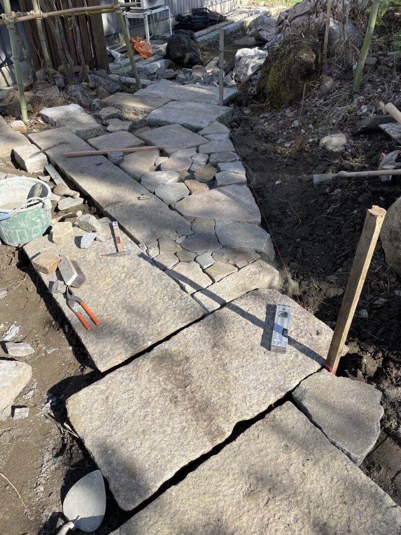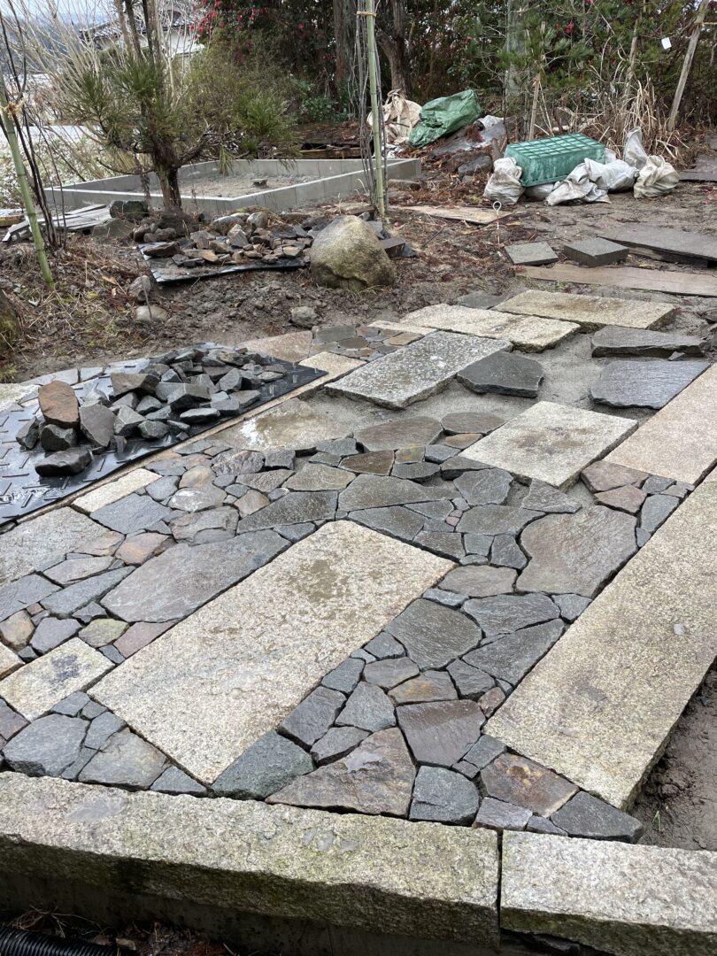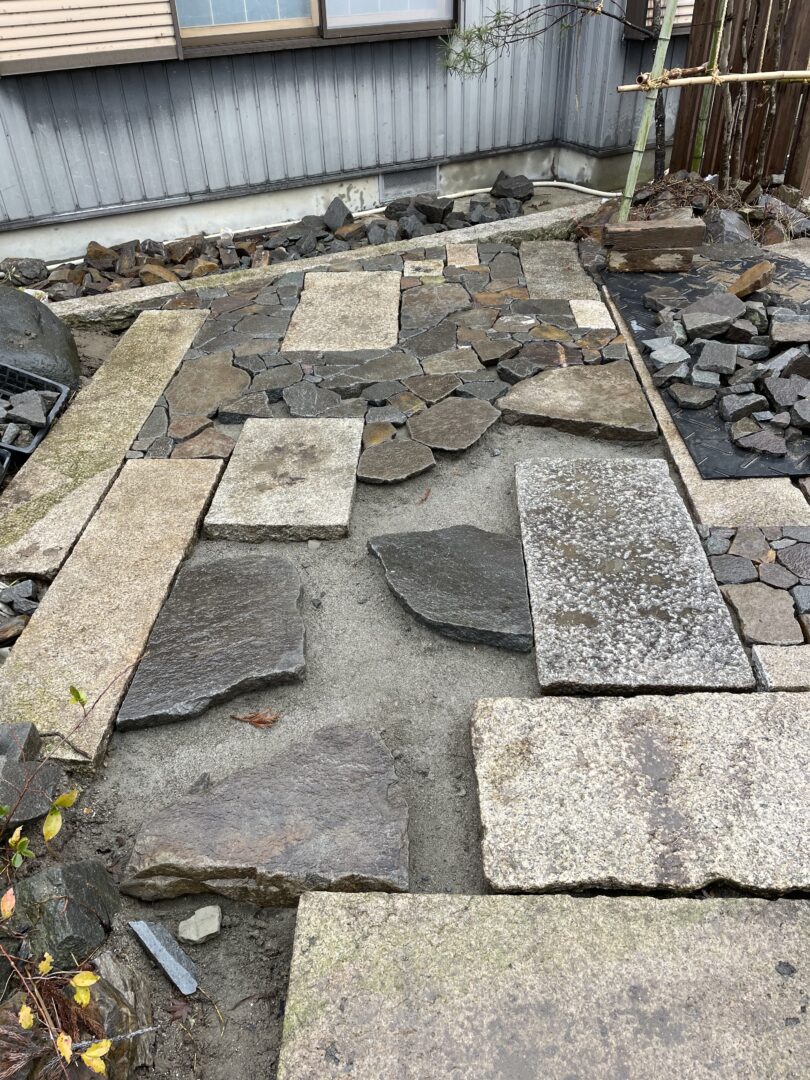 広場的スペースを畳石で仕上げた。こちらは経年風化しても変わらぬ景色でさらにより良い味になってくれてるだろうと思いも込めて自然石を使いました。また手仕事を感じられるこだわりのポイントでもあります。